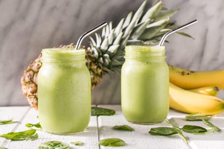 Blend spinach and liquid until smooth. Add fruit and continue blending til fully incorporated.